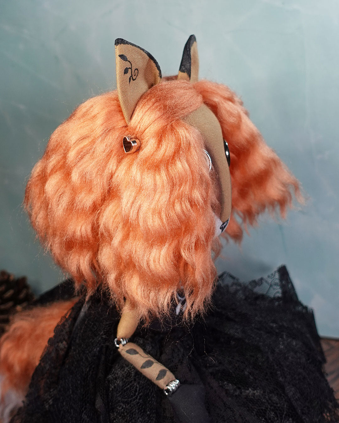 This one of a kind, Gothic fox girl art doll measures 26cm (around 10") from head to toe, with another 2cm for her ears. Marigold is made from quilting cotton, jointed with antique silver effect, metal beads at the shoulders, elbows, wrists and knees. The neck is button jointed.